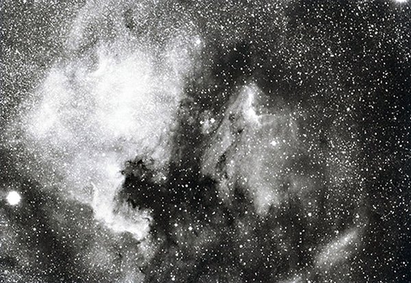 Der Nordamerikanebel, der im NEW GENERAL CATALOGUE als NGC 7000 angegeben ist, ist ein diffuser Gasnebel. Er erstreckt sich über ein Gebiet von 120 mal 100 Bogenminuten und ist relativ leicht aufzufinden, da er sich westlich dicht neben Deneb, dem hellsten Stern im Sternbild Schwan befindet.Die hellen Stellen sind typisch für Emissionsnebel, die als H II - Gebiete bekannt sind. Seinen Namen verdankt er seiner Form, die an den nordamerikanischen Kontinent erinnert. Rechts daneben erkennt man auf dem Bild einen weiteren Gasnebel, der wegen seiner Form als Pelikannebel bezeichnet wird. Beide Nebelgebiete sind durch Dunkelwolken voneinander getrennt. Letztere bestehen aus interstellarem Staub, der nur wenige Grad über dem absoluten Nullpunkt von minus 273° liegt. Beide Nebel haben eine Entfernung von etwa 4000 Lichtjahren, wobei nach neuesten Erkenntnissen der Abstand wesentlich geringer sein soll. Die Dunkelwolken liegen vor beiden Gasnebeln.